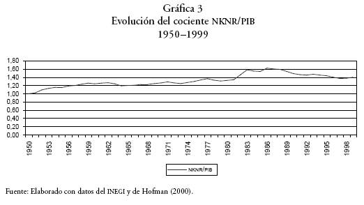 Así, el cociente NKNR/PIB ha tenido el comportamiento presentado por la Gráfica 3. Esta gráfica resulta relevante porque ilustra con claridad al menos dos cosas: 1) que la relación NKNR/PIB para México dista de aquella observada para los países desarrollados5; y 2) que la tendencia al alza observada, sorprendentemente, hasta finales de los ochenta, no se ha mantenido, por lo contrario, después de alcanzar un máximo de 1,62 en 1986, desciende a los niveles de finales de los setenta.