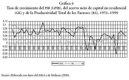 A partir de 1981 y hasta 1989, la PTF tiene valores negativos, en ese periodo el PIB presenta también las más bajas tasas de crecimiento. Los picos negativos que muestra el crecimiento del PIB en 1983 y 1986 corresponden a shocks en la demanda ocurridos por las crisis de 1982-1983 y 1986-1987, respectivamente. En la crisis de 1995, tanto la PTF como el crecimiento del PIB vuelven a desplomarse, y aunque muestran una recuperación, disminuyen de nueva cuenta para 1998-1999, cuando la PTF se aproxima, una vez más, a valores negativos. El crecimiento del capital, por su parte, presenta también una visible relación con respecto al comportamiento del crecimiento del PIB y de la PTF.
