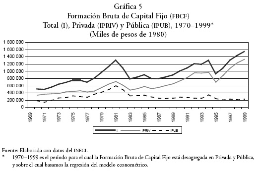 El comportamiento de la PTF se ha explicado a partir de diversas variables, en este estudio interesa en particular la relación que existe entre la inversión pública y el crecimiento económico, por lo que se presenta, en la Gráfica 5, el comportamiento de la Formación Bruta de Capital Fijo (FBCF), dividida en privada y pública según los datos generados por el INEGI. Como una de las hipótesis centrales para la especificación del modelo, suponemos que la formación de capital posibilita la incorporación del progreso técnico a los procesos productivos, lo que justifica su importancia en la determinación de la PTF.