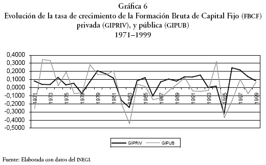 La Gráfica 6 muestra la evolución de las tasas de crecimiento de la FBCF pública y privada. Su relevancia estriba en que este comportamiento permite plantear la hipótesis de que, en cierta medida, la disminución de la tasa de crecimiento de la inversión pública causa también que disminuya la tasa de crecimiento de la inversión privada y, a final de cuentas, la disminución global de la inversión; lo cual concuerda con la hipótesis de la complementariedad entre capital público y privado (Ramírez, 1994).