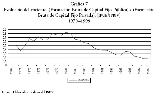 La Gráfica 7 muestra la evolución del cociente: (FBCF Pública) / (FBCF Privada). En 1981, año en que alcanza su máximo en el periodo estudiado, este indicador inicia una caída casi libre que, con un ligero repunte en 1994, continúa hasta 1999, pasando así, de algo más de 0,8 a menos de 0,2; el descenso no podría ser más drástico. Es menester anotar que este hecho parece contradecir, en algún grado, la hipótesis de la complementariedad entre inversión pública y privada, pues de verificarse ésta, un descenso en la inversión pública conllevaría un descenso en la inversión privada, de modo que el cociente no caería de forma tan dramática. Sin embargo, esto tiene que tomarse con cautela y analizarse con detalle, ya que en el caso de México y durante la administración Salinista, para poner un ejemplo, se establecieron concesiones privadas para la construcción y administración de varias autopistas, lo cual puede interpretarse, de cierto modo, como un crowding out de la inversión pública por parte del sector privado.6