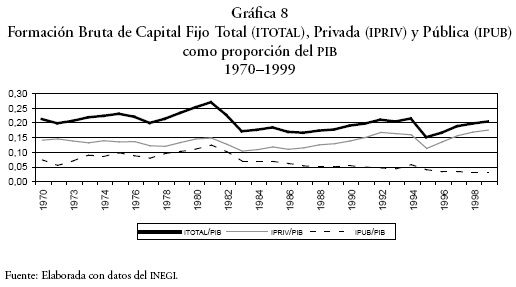 Para finalizar el análisis gráfico hasta aquí presentado, elaboramos la Gráfica 8 que muestra la evolución de las inversiones anuales privada y pública como proporción del PIB. Esta gráfica, junto con las números 5, 6, y 7, hace ver que la inversión pública ha mantenido un decrecimiento sostenido desde 1981, por lo cual puede argumentarse que su efecto sobre la PTF no es un fenómeno debido a los shocks sufridos por la economía, sino se trata de una relación causal efectiva.