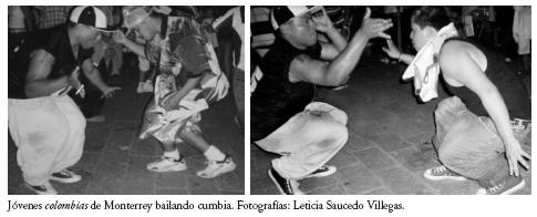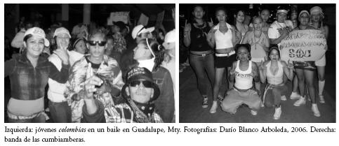 La cumbia es la música más solicitada para los bailes y, desafortunadamente, ha terminado por asociarse con la violencia, a tal punto que los medios masivos han impulsado conscientemente el paseo vallenato romántico comercial15 por encima de la cumbia, debido a la idea de que la cumbia genera violencia. Esta asociación proviene del que la cumbia, en Monterrey, la sienten los jóvenes de manera superlativa, la interpelación del ritmo a los cuerpos es muy marcada, genera una gran energía y movimiento. En la actualidad, se baila suelta sin pareja, en círculos alrededor de la pista y predominan los hombres. Cuando suena una cumbia, todos saltan a la pista y comienzan a moverse con gran ímpetu, si esto lo colocamos en un escenario, una "pista de baile" reducida, como es el caso frecuente, comienzan las fricciones corporales (como en cualquier discoteca). A esta fricción sumemos el alcohol y las drogas (una vez más, como en cualquier sitio nocturno). Ahora, a la ecuación se le agrega la rivalidad entre bandas y el uso generalizado de "símbolos"16 para reconocerse unos a otros y ¡ya tenemos el resultado! Así, los músicos colombias y los discjokies saben que una cumbia va a "prender" a todo el público y será un éxito dentro de la fiesta; pero también saben que después de una ronda de cumbias inevitablemente se van a armar los golpes. Cuando esto sucede, se debe tocar un paseo vallenato, para que los implicados se calmen y los demás vayan a buscar a sus novias, a sus parejas y así se apacigüe el ambiente.