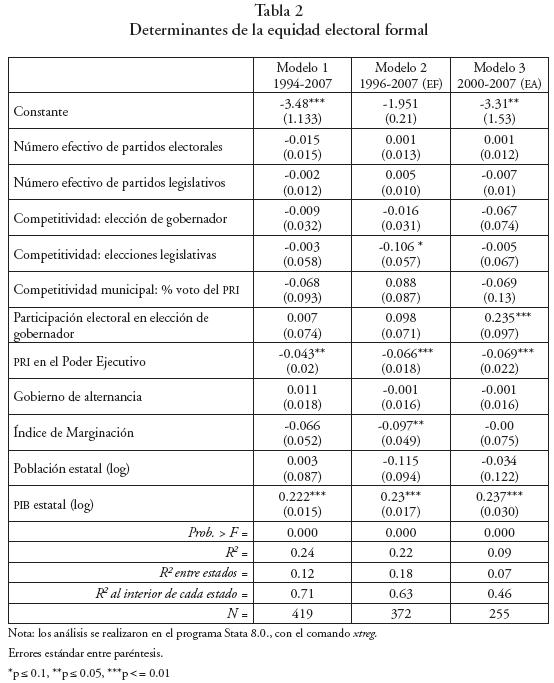 Para contrastar empíricamente las hipótesis enunciadas, he desarrollado tres modelos estadísticos que se presentan en la tabla 2. En estos modelos, las variables independientes y de control de carácter político son introducidas con retrasos temporales. Por ejemplo, para evaluar los determinantes políticos de la equidad electoral en el estado i, en el año t, los valores de las variables que miden el número efectivo de partidos, la competitividad electoral, la participación electoral y el partido que ocupa el poder ejecutivo estatal corresponden al momento (t e) donde e representa el número de años que han pasado desde las elecciones inmediatamente anteriores. Los valores de e pueden variar entre 1 y 6, dependiendo de si las elecciones anteriores son legislativas, municipales o de gobernador. Esto permite estimar la influencia que tienen los factores políticos antecedentes sobre el valor de la EEF en un momento dado.