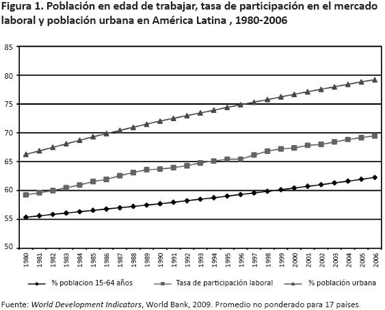 El final del modelo ISI y la confianza en el Consenso de Washington tuvieron un efecto radical al convertir las relaciones de mercado en el canal predominante por medio del cual la gente busca y obtiene un lugar en el mundo. Esta transformación estuvo acompañada de dos factores adicionales: paisajes urbanos transformados y expandidos y la revolución de las comunicaciones, que aumentó la difusión de nuevos patrones de consumo mediante sus efectos demostrativos. En otras palabras, sustancialmente más personas estaban viviendo juntas en ciudades, se estaban convirtiendo en trabajadores potenciales y, de hecho, buscaban abiertamente la participación en el mercado laboral, como se observa en la figura 1.