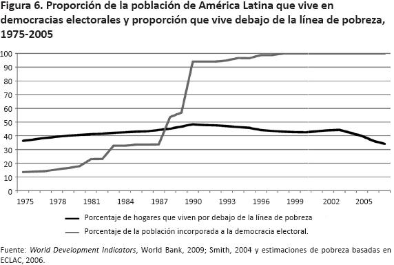 Las sociedades latinoamericanas presentan niveles de desigualdad y pobreza que casi dos décadas de democracia no han podido resolver: en muchos casos, la pobreza se ha mantenido en niveles asombrosamente altos y, en casi todos, las desigualdades se han hecho más profundas. Esto marca un doble reto al futuro democrático en la región: el desafío de fortalecer o incluso construir los pilares sociales de la democracia y el de demostrar a la ciudadanía que la democracia puede tener un impacto positivo sobre el bienestar social. Como se muestra en la figura 6, esa "función social de la democracia" no se ha conseguido porque, pese a la generalización de la democracia electoral en la región, no ha disminuido la proporción de latinoamericanos que vive en condiciones de pobreza.