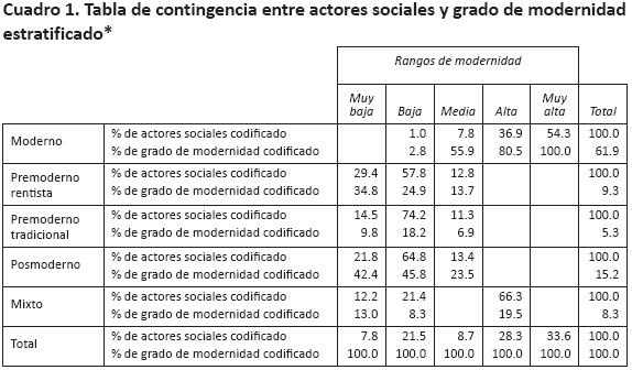 iii. Al nivel desagregado, el índice de representatividad es significativo para todos los actores sociales, a excepción de los premodernos tradicionales. En cambio, el grado de modernidad no tuvo la significación suficiente para ninguno de los actores considerados aisladamente.