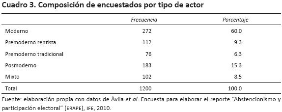 Una cosa es sentirse mal representado, y otra, traducir ese nivel de representatividad en abstención. Todos los actores reseñados anteriormente perciben que ni las autoridades electas ni los partidos los representan adecuadamente, si juzgamos por el igr, que, en promedio, registra cada uno de ellos: moderno, 2.88 (de: 2.2); premoderno rentista, 3.1 (de: 1.97); premoderno tradicional, 2.99 (de: 2.1); posmoderno, 2.8 (de: 2.1), y mixto, 2.7 (de: 2.1).