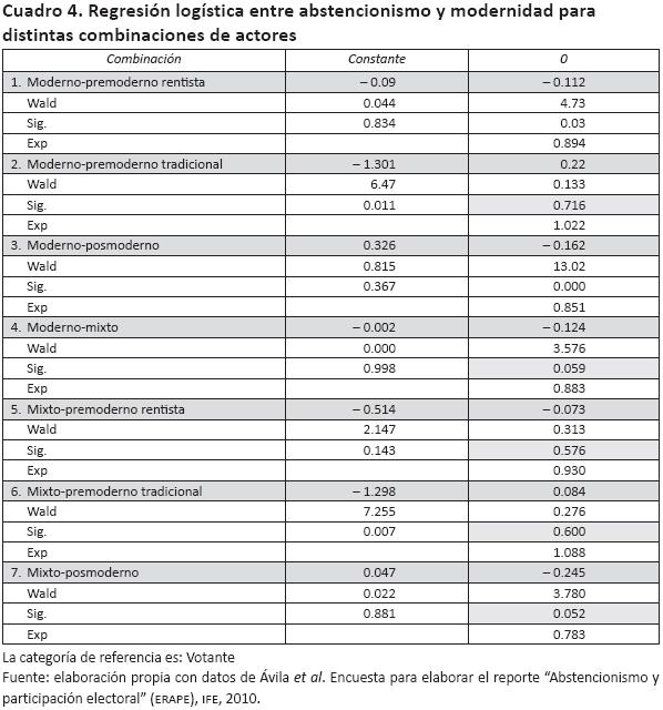 El cuadro 4 muestra que sólo cuando los modernos se combinan con los rentistas y los premodernos, las relaciones entre abstencionismo y grado de modernidad resultan significativas. Son estas combinaciones las que provocan la relación general entre ambas variables y las que permiten traducir ésta última en una decisión sobre abstenerse o no. Las dos mezclas corroboran la hipótesis de conflicto entre los actores modernos, por una parte, y los pre y posmodernos, por la otra. Esto nos conduce a nuestra segunda proposición: