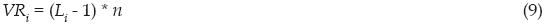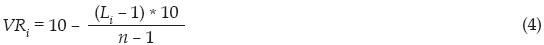 Donde VR es el valor de la respuesta z-ésima; L, es el lugar que ocupa la respuesta de mayor a menor, y n es el número de respuestas posibles. Como se puede observar, el rango de VR va de 0, que corresponde a "nada", hasta 10, que equivale a "totalmente".2 Entonces para cada autoridad j-ésima: