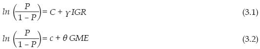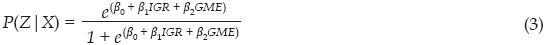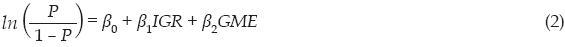 De esta forma, la probabilidad condicionada de abstenerse variará con los valores distintos de Z (igr, por ejemplo), dado un valor determinado de la otra variable X (gme, por ejemplo). En las secciones posteriores se explícita cómo fueron estimados estos índices. En caso de que el análisis multivariado arroje algún coeficiente no significativo (>0.05) y otro significativo, la ecuación (2) es estimada en forma univariada: