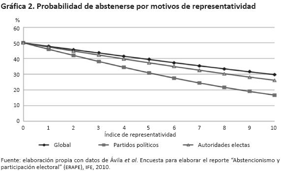 Sin embargo, lo que me interesa es la relación entre abstencionismo y representatividad. Con este propósito, se estimó la probabilidad de abstenerse por motivos de representatividad, a partir de los resultados reportados en el cuadro 2 para el conjunto de entrevistados (renglón 1). Como se puede apreciar, la probabilidad de abstenerse electoralmente declina con el ascenso de la representatividad de las autoridades y partidos, así como de la global. Para determinar cuál es esa probabilidad, proseguimos con el procedimiento descrito en la ecuación (3). Los resultados los presentamos en la gráfica 2.