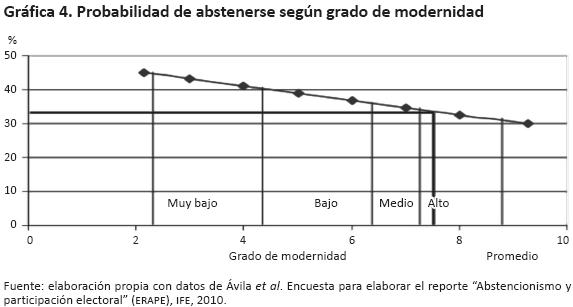 Así, es razonable que el abstencionismo disminuya con el grado de modernidad. Para estimar esta relación, partí de los resultados de ecuación logística general multivariada (cuadro 2), que corroboran que la probabilidad de abstenerse disminuye con el grado de modernidad, como lo muestran el signo del parámetro correspondiente y la gráfica 4, que describe esta probabilidad.