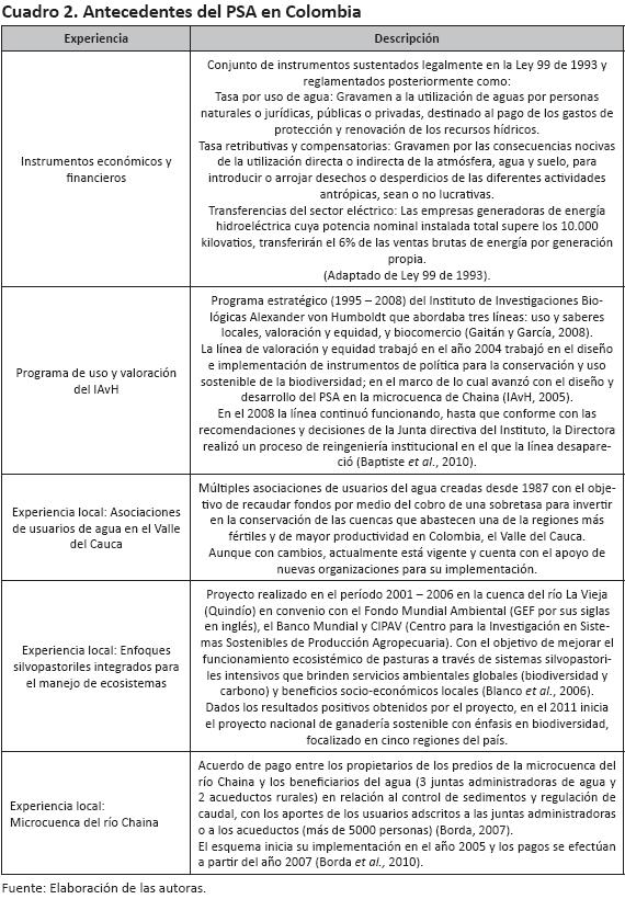 Adicional al CIF - Conservación, los entrevistados mencionaron las experiencias descritas en el Cuadro 2 como antecedentes importantes del PSA en Colombia, considerando logros significativos como los primeros instrumentos económicos y financieros desarrollados formalmente en el país para aportar a la conservación de los recursos naturales, así como el programa de investigación en uso y la valoración del Instituto de Investigaciones Biológicas Alexander von Humboldt (IAvH) y las primeras tres experiencias locales en PSA que surgieron en el país y que sustentan gran parte de los recientes ejercicios desarrollados actualmente en Colombia.