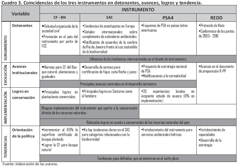 De esta manera se evidencia que en Colombia los instrumentos para la conservación rápidamente pierden vigencia y aunque el diseño e implementación de un instrumento no ha concluido, los esfuerzos institucionales se comienzan a orientar al diseño de nuevas herramientas. Actualmente ninguno de los instrumentos analizados es parte fundamental de la política pública que en materia de conservación se desarrolla en el país.
