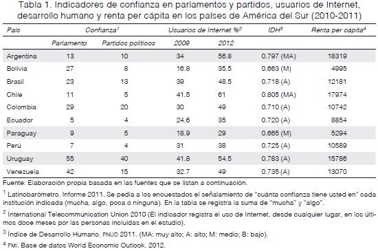 La diferencia en el patrón de difusión de Internet (Hb) también se incorporó en este análisis. Al iniciar la investigación, con base en las otras variables mencionadas y en datos de ITU 2009, se optó por Uruguay (42%, difusión alta en términos relativos), Argentina (34%, difusión intermedia) y Paraguay (19%, difusión baja). Sin embargo, al volver a estos datos -una vez finalizado el trabajo empírico- se encontró un cambio destacado que mostraba la velocidad de crecimiento de la red en los países sudamericanos y alteraba nuestra clasificación, ya que, mientras Paraguay se mantenía en el último sitio, Argentina ocupaba ya el segundo lugar (después de Chile) superando a Uruguay (57 y 54%, respectivamente) (tabla 1). Al contrastar el indicador de desarrollo humano (IDH) o la renta per cápita de los países y sus niveles de difusión de Internet, se observa la correlación existente.6