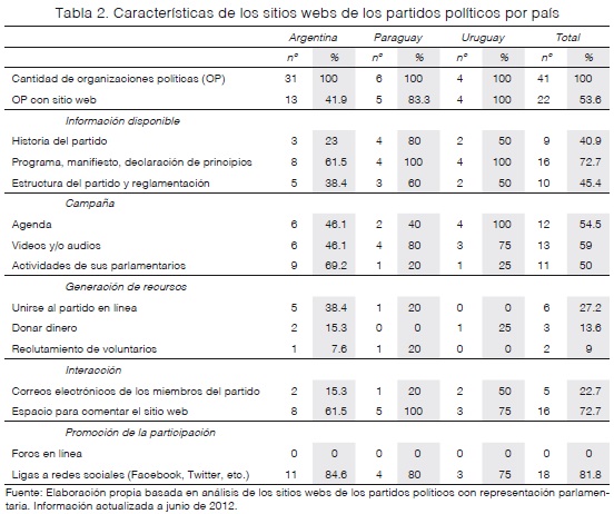 El estudio analizó un total de 41 organizaciones políticas, de las cuales 22 tenían sitios web (53.6%) (tabla 2). Aunque la imagen inicial sería la de un panorama heterogéneo, la mayoría de los partidos realizan un pobre y marginal uso de las oportunidades que ofrece Internet. Del total de webs analizadas, sólo cuatro ítems son ofertados por más de la mitad de las páginas: el programa de la organización (72.7%), videos y audios (59%), espacios para comentar en la Web y ligas a redes sociales (72.2 y 81.8%, respectivamente). Los usos de la Web para reclutar voluntarios, afiliación en línea o recibir donaciones, son los menos extendidos en todos los casos. Ni la actividad de los parlamentarios, ni los correos electrónicos de los miembros del partido (a excepción de que algunos ofrecen la dirección del presidente/secretario del partido o un contacto administrativo), ni los foros, tienen mayor difusión en las webs partidarias (ninguno ofrece foros de debate). Aunque el 81.8% de las páginas redirigen hacia cuentas del partido en Facebook y Twitter.