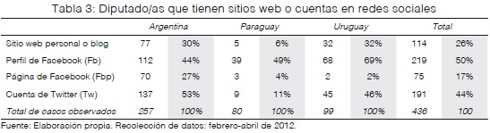Con respecto a la presencia en línea a través de webs, blogs, Facebook y Twitter, se observó que un tercio de los diputados argentinos y uruguayos han abierto su sitio web o blog (30 y 32%, respectivamente), pero que sólo el 6% de los representantes paraguayos lo han hecho. Los diputados argentinos son los que tienen mayor cantidad de cuentas de Twitter17 (53%), y es el medio más popular entre ellos. Los diputados paraguayos y uruguayos se inclinan por los perfiles de Facebook (49 y 69%, respectivamente). Sin embargo, Twitter no deja de ser popular entre los segundos, casi la mitad de los diputados posee cuenta (46%); en Argentina sucede algo similar con las preferencias por los perfiles de Facebook (44%). La presencia de los diputados paraguayos en Twitter es excepcional, apenas el 10% tiene cuenta (nueve diputados). Finalmente, la utilización de páginas de Facebook está muy extendida entre los representantes argentinos: registran setenta páginas activas (27%), lo que no ocurre en Uruguay y Paraguay (4 y 3%, respectivamente). Una observación comparada entre perfiles, páginas y cuentas, muestra que veinte diputados argentinos tienen los tres espacios (y ocho tienen además página web o blog). De los titulares de las setenta páginas, sólo diez no tienen cuenta en Twitter. En Paraguay sólo un diputado tiene perfil, página, blog y cuenta en Twitter, mientras que en Uruguay en ningún caso se cumplen las tres condiciones (tabla 3).