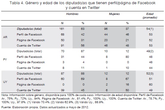 En cuanto a la edad, en casi todos los casos el promedio es menor al de la edad de la cámara. La excepción son los que han abierto páginas de Facebook en Uruguay: mientras el promedio de la cámara es de 52 años, los diputados con Facebook presentan una media de sesenta años. En Paraguay, los diputados con cuenta de Twitter (44 años) están por debajo de la media de la cámara (49 años), aunque en este caso más de la mitad tiene menos de cuarenta años. Finalmente, concuerda con los promedios generales el nivel educativo alcanzado (universitario) por los diputados usuarios de redes.