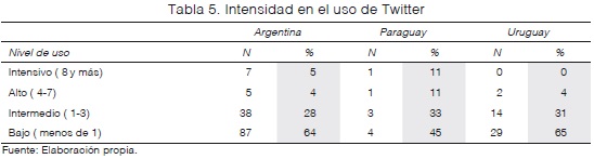 Por último, se observó también la intensidad de uso de Twitter, midiéndolo como el número de publicaciones que un parlamentario realiza en un periodo determinado (desde la creación de la cuenta hasta abril de 2012). La mayoría presentó un uso bajo o intermedio (tabla 7). En Argentina, el promedio de publicaciones es de 16 tweets por día, en Paraguay de once, y en Uruguay de nueve. Sin embargo, los promedios pueden ocultar un uso errático debido a que muchos diputados muestran una intensa actividad en unos días determinados y luego no hay actividad por varios días (por ejemplo, 131 tweets en un día, @Carlos_Kunkel, el 14 de marzo de 2012).