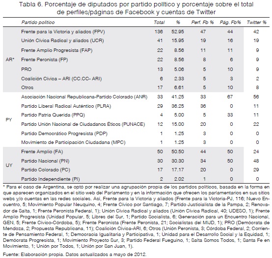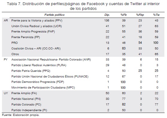 En Argentina, por ejemplo, todos los diputados del PRO (13 de 257) tienen cuentas de Twitter, mientras que un alto porcentaje también es usuario de Facebook (54% tiene páginas, 46% tiene perfil). En el caso uruguayo, para el Partido Colorado (17 de 99 asientos) se identificó que el 82% de sus diputados tiene perfil de Facebook y el 77% cuenta de Twitter. Mientras que, en Paraguay, los dos diputados de los partidos más pequeños tienen perfiles de Facebook, y es el Partido Patria Querida el que tiene los porcentajes más altos de presencia en redes sociales (tabla 7).