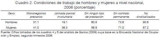 Las distintas formas que asume el trabajo, y el hecho de que los tipos de trabajo y los significados del mismo son productos históricos, moldeados por el contexto, hace de su comprensión una tarea compleja. Aquí se distinguen los conceptos de trabajo, empleo y ocupación de una manera simple y operativa y centramos el análisis en el empleo. Con el concepto trabajo aludimos a las actividades, remuneradas o no, que como miembros de una sociedad realizamos para obtener bienes o servicios (para el consumo o para la venta), para lograr la sobrevivencia y reproducción. Mediante el trabajo se obtienen compensaciones (el trabajo retribuye), pero no siempre remuneraciones. Un empleo subordinado (INEGI, 2005) es una relación laboral que se da con una instancia superior a la cual se le rinde cuentas (un jefe, un consejo o un patrón). El empleado ocupa una plaza o un puesto de trabajo. Las personas que lo desempeñan pueden o no recibir una remuneración y, por ello, se clasifican en trabajadores remunerados y no remunerados. La ocupación, por último, es entendida "[...] en un plano más amplio, donde no sólo se incluye a quienes trabajan para alguien sino también a quienes cuentan con un negocio propio o realizan una actividad por su cuenta. Ocupación es, pues, un término más amplio, en tanto que el de empleo es más específico y caracterizado por una relación de subordinación" (INEGI, 2005: p. 16). Bourguignon (2005), a pesar de que no ofrece la profundidad conceptual que sería necesaria, nos brinda claridad operativa respecto de los buenos y los malos empleos. Los buenos empleos son los que dan a los trabajadores un pago decente y protección social adecuada. Los malos son, por el contrario, los que se desempeñan bajo condiciones difíciles, con bajos salarios y sin protección social. La ausencia de un seguro de desempleo ha significado que en los llamados países en desarrollo "[...] el desempleo abierto está de hecho limitado a un pequeño número de personas que tienen suficientes recursos para esperar a que un empleo, con las características que buscan, surja [...]" (Bourguignon, 2005: p. 3).5 Por ello, según este autor, los desempleados utilizan sus propios recursos o reciben el apoyo de sus familias mientras esperan "buenos empleos". La mayoría de los trabajadores, sin embargo, se ven forzados a abandonar esta categoría para buscar y aceptar ocupaciones que, aunque precarias, les permitan sobrevivir. Las jornadas extremadamente largas o involuntariamente parciales, en pésimas condiciones y con muy bajos ingresos son el común denominador de los mercados laborales. Estas personas no son desempleadas, "[...] tienen un empleo, pero simplemente tienen un mal empleo" (Bourguignon, 2005: p. 3). De acuerdo con estos planteamientos, la mayor parte de los hombres y mujeres ocupados en México tienen malos empleos (cuadro 2).