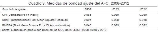 Tanto el RMSEA como el SRMR son menores a 0.05 y el CFI es bastante alto, de 0.985 o mayor. Con estos resultados contamos con suficiente evidencia para afirmar que nuestro modelo es plausible para los tres años, es decir, que no ha sido rechazado por la evidencia empírica.