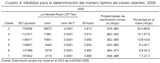 8 Tanto el análisis descriptivo anterior como el de clases latentes que se presenta a continuación, utilizó los datos del MCS-ENIGH. Agradecemos la generosidad e inagotable paciencia de Fernando Cortés, quien nos sugirió darle más fuerza al análisis y nos acompañó en este proceso (de lo descriptivo a las clases latentes).