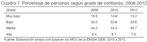 En el cuadro 7 podemos observar cómo se distribuye la población a lo largo del periodo comprendido entre 2008 y 2012 de acuerdo a su grado de confianza en el acceso a los favores. Dado que la estimación del grado de confianza es de corte transversal no es correcto hacer una comparación a través del tiempo, pues el grado de confianza en cada año depende de la distribución para dicho año de las seis preguntas sobre redes sociales.