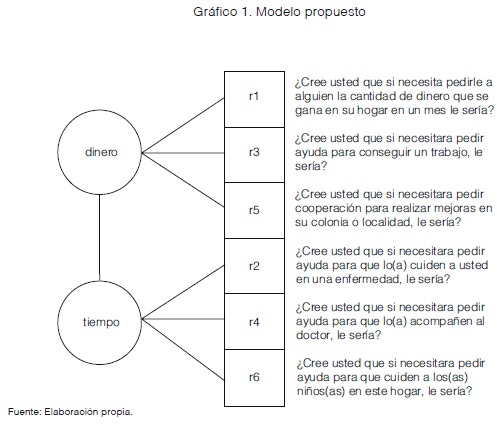El modelo factorial confirmatorio contiene dos variables latentes: dinero, que se mide a través de las variables manifiestas r1, r3 y r5, y tiempo, que se mide a través de r2, r4 y r6. El AFC mide con cierto grado de error dichas dimensiones (indicadas con ei). Asociados al dinero están los préstamos monetarios, las contribuciones en efectivo para realizar mejoras en el entorno y la ayuda para conseguir un trabajo. Con la variable latente tiempo están relacionadas las preguntas que indagan sobre el acceso a ayuda para el cuidado en una enfermedad, compañía para ir al doctor y para cuidado de los menores en el hogar.