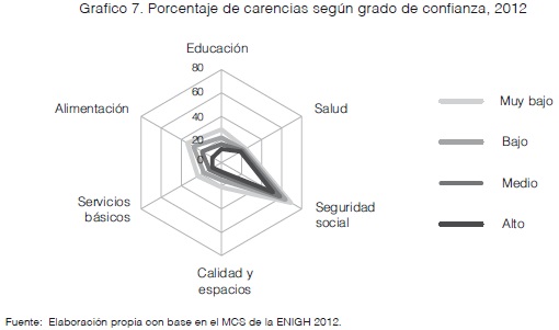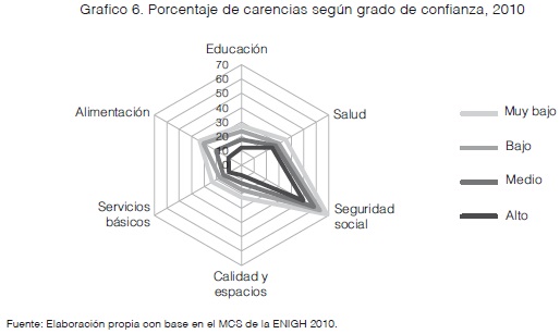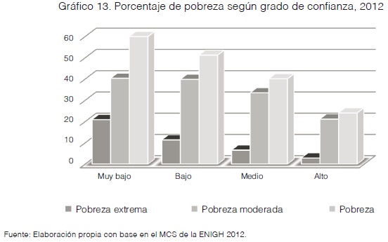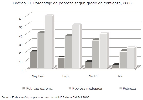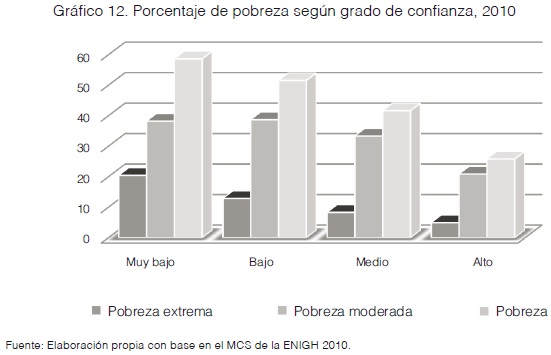 Analizados los indicadores de carencias sociales e ingreso por separado, lo que resta es averiguar la relación entre el nivel de pobreza y el grado de confianza. El análisis indica que a menor pobreza el grado de confianza aumenta. Este comportamiento se observa para los tres tipos de pobreza, la total, la moderada y la extrema. Sin embargo, parece haber menores saltos, dependiendo del grado de confianza, para los denominados pobres moderados, es decir aquellas personas que no son pobres extremos, pero son pobres.