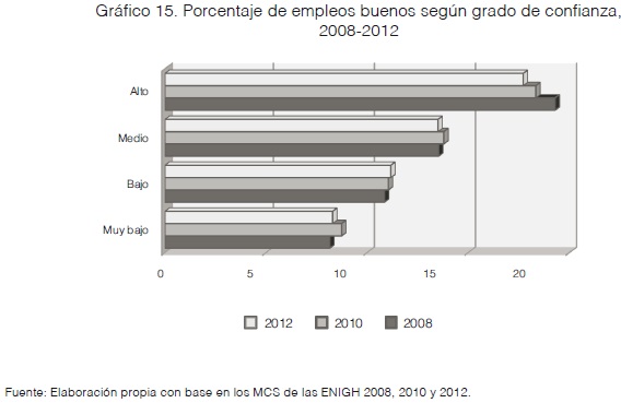 Al clasificar a los trabajadores en aquellos que cuentan con buenos o malos empleos de conformidad con el número de prestaciones laborales que tienen, considerando como un buen empleo aquél que ofrezca las seis prestaciones laborales arriba citadas, y un mal empleo el del trabajador a quien le falta al menos una de ellas, sólo alrededor del 12% de los trabajadores cuentan con un buen empleo en los tres años. Sin embargo, en el gráfico 15 se observa el comportamiento diferenciado entre clases. Los trabajadores con buenos empleos que tienen muy bajo grado de confianza no alcanzan a ser ni el 10%, mientras que aquellos con alto grado de confianza se encuentran para los tres años por arriba del 17 por ciento.