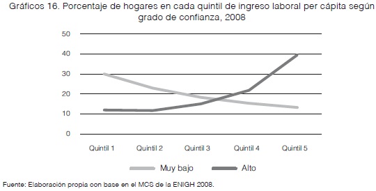 Para analizar la relación entre el grado de confianza que reportan las personas en los hogares y el nivel de ingreso laboral que tienen, se construyeron quintiles de ingreso laboral per cápita por hogar. Veremos cuántos hogares caen en cada quintil dependiendo de si los integrantes del hogar tienen un grado muy bajo o alto de confianza. Los resultados se presentan en los gráficos 16, 17 y 18.