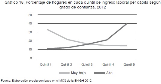 Para los hogares con grado de confianza alto, el porcentaje mayor se presenta en el quintil con mayores ingresos, mientras que para los hogares con grado de confianza muy bajo pasa lo contrario, el mayor porcentaje se concentra en el quintil con menores ingresos laborales.