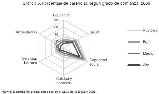 En los gráficos 5, 6 y 7 se observa el porcentaje de personas con cada una de las carencias sociales. Resulta importante notar dos cosas. Primero, que el grado de confianza en redes sociales y el porcentaje de las carencias están correlacionados. Las carencias siempre están más acentuadas en los grados bajos de confianza. Esto habla de una relación inversamente proporcional entre el nivel de carencias y el nivel de confianza que reportan las personas: a mayor grado de confianza, menor porcentaje de carencias. Segundo, que si bien a lo largo de los tres años se observa la misma relación, las brechas para 2008 entre grado de confianza son más acentuadas que las de 2010, y lo mismo sucede entre 2010 y 2012. Este efecto puede deberse a una disminución en general de las carencias sociales de 2008 a 2012, un cambio en el grado de confianza a través de los años, o bien, una combinación de ambas.