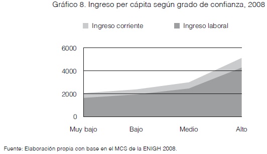 La pobreza es un fenómeno de carácter multidimensional. No obstante, consideramos que el ingreso es extremadamente importante. Como esperábamos, el grado de confianza guarda también una relación con el ingreso de las personas porque la pérdida de éste modifica las dinámicas económicas y sociales del hogar. Los gráficos 8, 9 y 10 muestran el nivel de ingreso corriente total y el ingreso laboral per cápita a pesos de agosto de cada año, según el nivel de confianza con el que cuentan las personas. Se observa que a mayor grado de confianza en redes sociales, el ingreso aumenta. Sin embargo, se muestra un aumento mayor cuando el grado de confianza es alto.