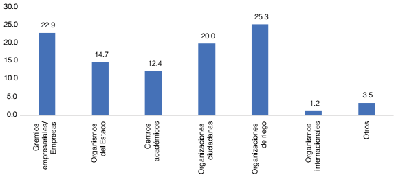 | Áreas abordadas | Empresarios | Organismos del Estado | Organizaciones ciudadanas | Organizaciones de riego | Centros académicos | Otros |