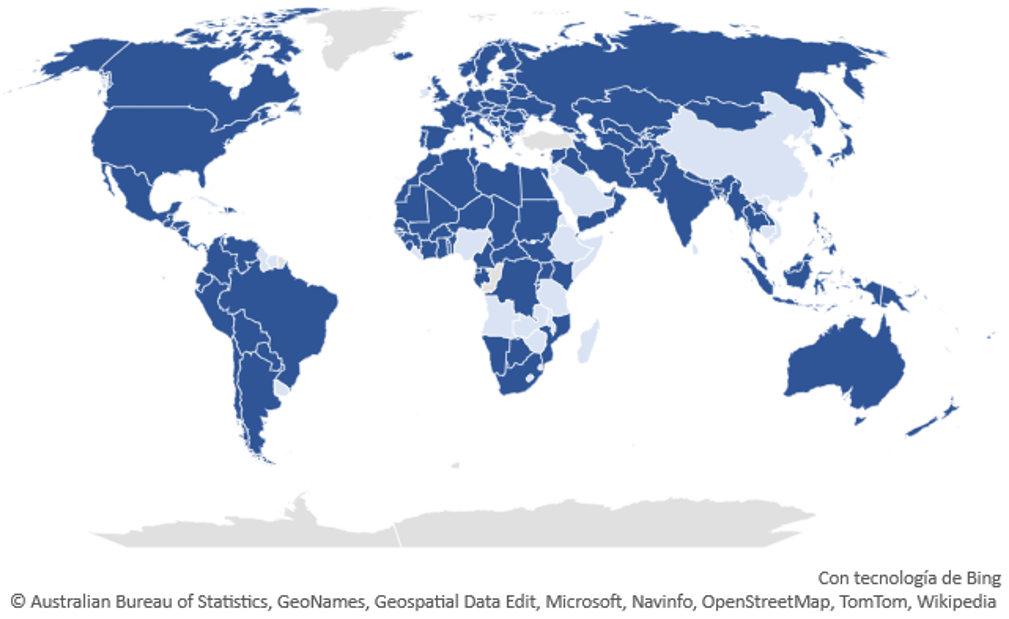 Ahora bien, se ha identificado que hoy es más común que los Estados reconozcan el derecho a votar en el exterior a que no lo hagan. Según Wellman et al. (2022), a 2020 había 142 países que formalmente reconocían este derecho, y 52 que no. En el mapa 1 se observan en azul los que lo reconocen y en blanco los que no.