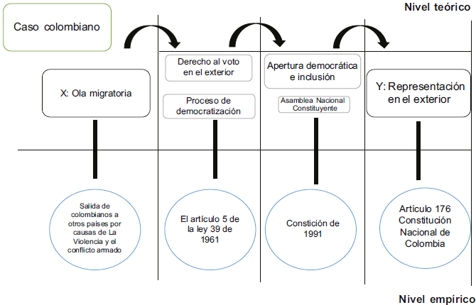 La metodología del artículo es cualitativa. El alcance que se pretende con este trabajo es identificar las razones de que se adopte la representación en el exterior en Colombia y Ecuador, y para ello se estudian las secuencias históricas en ambos países para identificar la creación de los escaños. Es decir, que se trabaja con un N pequeño con la intención de realizar un estudio en profundidad con alta densidad de información (Della Porta, 2013) para encontrar un mecanismo causal en los dos casos.