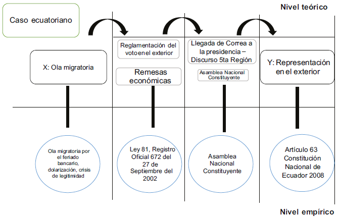 Como se mencionó en la metodología, las secuencias son eventos ordenados: Evento A > Evento B > Evento C = Resultado. En el gráfico 4 se muestra la trayectoria de las secuencias de Ecuador hasta llegar al reconocimiento de los escaños reservados. Allí se grafica que la ola migratoria ocasionada por la crisis del feriado bancario generó una serie de eventos que fueron creando mecanismos autorreproductivos para el reconocimiento político-electoral de los migrantes (el resultado). También se encuentra que los procesos autorreproductivos como el envío de remesas económicas y el posterior impulso del correísmo de los derechos de los migrantes fueron claves para expandir el mecanismo causal y amplificarlo. El gráfico 4 también evidencia cómo se plantea a nivel teórico la secuencia y cuáles son sus observables empíricos.