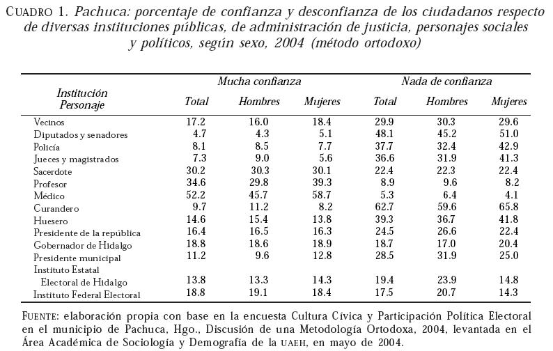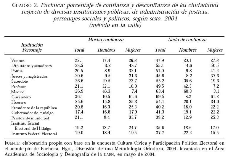 En relación con los indicadores valorativos y de juicio político, en el estado de Hidalgo se encuentran aspectos que remiten a una sociedad que tiene desconfianza de las instituciones de administración de justicia y de diversos personajes sociales, y aún se confía en figuras tradicionales como son el sacerdote, el profesor, el médico y el ejército. En un trabajo comparativo entre los municipios de Pachuca e Ixmiquilpan, en donde se discutía la propuesta teórica de Huntington en torno al proceso democratizador y el desarrollo, se encontró que Pachuca presenta un comportamiento muy similar al observado en el ámbito estatal en torno a la confianza depositada en diversos actores sociales.