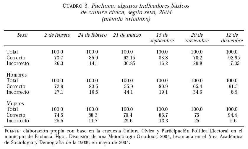 Como un indicador grueso de la cultura cívica, se eligieron algunas fechas importantes en la historia de México, contrastadas con dos fechas de celebración religiosa, el 2 de febrero y el 12 de diciembre, obteniendo resultados interesantes (cuadros 3 y 4). Dentro del grupo de entrevistados de manera ortodoxa encontramos que la fecha más recordada por los pachuqueños es el 12 de diciembre, día de la Virgen de Guadalupe; y la fecha menos recordada es el 21 de marzo, día del natalicio de Benito Juárez, en donde casi cuatro de cada diez pachuqueños no la recuerdan. En cuanto a las diferencias según sexo, se advierte que las mujeres recuerdan más las fechas, lo que sugiere que pueden tener una mayor cultura cívica que los hombres.
