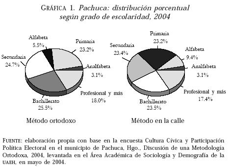 Inicialmente, se destaca que mediante el método ortodoxo (aplicación de cuestionario en casa), la obtención de la información según el grado escolar es muy semejante a los resultados obtenidos con la metodología alterna (entrevista en la calle). La población analfabeta fue prácticamente la misma, 3.1%; en el rubro de los que sólo saben leer y escribir existe una diferencia de 3.9 puntos porcentuales, representando esto la mayor diferencia. Respecto a los grados de escolaridad de primaria, secundaria, bachillerato, profesional y posgrado no existe variación significativa (gráfica 1).