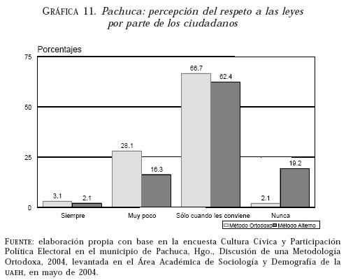 Los entrevistados de manera ortodoxa dijeron que 66.7% sólo respeta las leyes cuando les conviene, 2.1% que nunca lo hacen, 28.1% que muy poco y sólo 3.1% que siempre se respetan las leyes. En el caso de los entrevistados en la calle, encontramos que 62.4% dijo que sólo cuando les conviene, 16.3% muy poco, 2.1% siempre y 19.2% nunca. Es decir, observamos que el no ubicar a un entrevistado en su hogar le permite una mayor libertad para decir cómo entiende, comprende y vislumbra los procesos políticoelectorales.