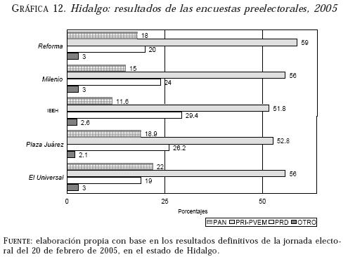 Esta metodología alterna fue utilizada diez días antes de las elecciones para elegir al gobernador en Hidalgo. La encuesta fue patrocinada por un diario local llamado Plaza Juárez. El interés radicaba en medir la preferencia electoral por parte de los sufragantes hidalguenses, y poder predecir los resultados finales del proceso electoral. En este ejercicio se presentaron diversas encuestas, todas de corte ortodoxo, entre las que destacaron las publicadas por los diarios El Universal, Milenio y Reforma (gráfica 12).