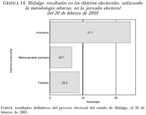 b) Plaza Juárez: utilizó la metodología alterna, entrevistando a 1 742 sujetos; la muestra se calculó con una significancia de 90% y una precisión o margen de error de 10%. Se ofrecieron resultados a escala estatal, así como en cada uno de los 18 distritos electorales. Se acertó en los resultados estatales, siendo los más acercados a los resultados definitivos publicados por el Instituto Estatal Electoral de Hidalgo (IEEH), y en once distritos electorales; asimismo se acercaron los resultados en tres distritos electorales y se falló en cuatro (gráfica 14). Esto indica que la metodología alterna, bien aplicada, con rigurosidad, pero dando la confianza al entrevistado para no sentirse ubicado en su espacio privado, es altamente eficiente.