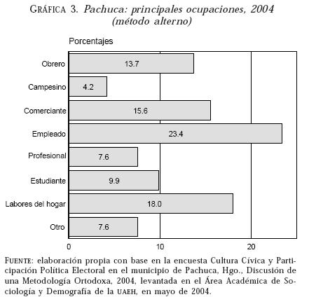 La distribución según localidad ruralurbana fue a partir de los datos estadísticos del XII Censo de Población y Vivienda del año 2000, y se desglosó de la siguiente manera: Pachuca, 89% urbana y 11% rural. De igual forma, como la edad es un factor importante en la concepción político electoral, se establecieron tres grandes grupos tanto para hombres como para mujeres: el primero de 1829 años, el segundo de 3049 y el tercero de 5064 años, conformándose así: 40.9%, primer grupo; 39.6%, segundo grupo; y 19.5%, tercer grupo.