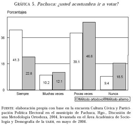 Ahora bien, revisando los datos en el ámbito estatal de una encuesta levantada en el 2002, la cual es representativa para la entidad hidalguense, se advierte que 14.8% dijo siempre votar, 21.5% muchas veces vota, 45.9% pocas veces sufraga y 17.8% nunca sufraga. Lo que parece indicar que las personas entrevistadas en la calle hablaron sobre la frecuencia del voto con menos restricciones que aquellos que se les preguntó en su hogar.