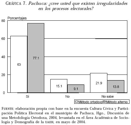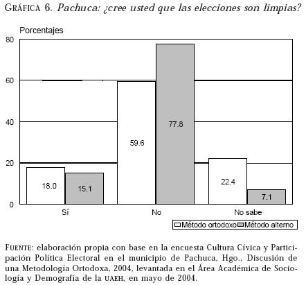 Al cuestionar a los electores si consideraban que las elecciones son procesos libres de opacidad, de los entrevistados de la forma ortodoxa 59.6% dijo que no, 18% manifestó que sí, y 22.4% dijo no saber. Pero si contrastamos estos resultados con los entrevistados en la calle encontramos lo siguiente: 77.8% dijo que no son limpias, es decir, 17.2% más se inclinó por esta respuesta, 15.1% dijo que sí son limpias, es decir, 2.9% menos que los entrevistados de forma ortodoxa. Por último, en rubro de no sabe, alcanzó 7.1% en los entrevistados en la calle, 15.3% menos que los entrevistados de manera ortodoxa (gráfica 6), lo que nuevamente parece indicar que aquellos entrevistados en sus hogares cuidan el emitir juicios sobre la transparencia de los procesos electorales.