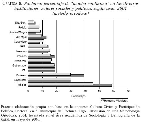 En cuanto a las diferentes metodologías, los entrevistados de forma ortodoxa, tanto hombres como mujeres, tienen una mayor confianza en el médico, en el sacerdote y en el profesor, aunque las mujeres tienden a ser más confiadas en el profesor que en el sacerdote (gráfica 8). Los diputados, senadores, la policía, los jueces y los magistrados son los actores sociales que menor confianza proyectan en la población. A esta lista se suma el presidente municipal y el curandero. Cabe mencionar que la figura del curandero no es muy recurrida en la ciudad de Pachuca; sin embargo, se tiene una mayor confianza en él que en las instituciones de administración de justicia.